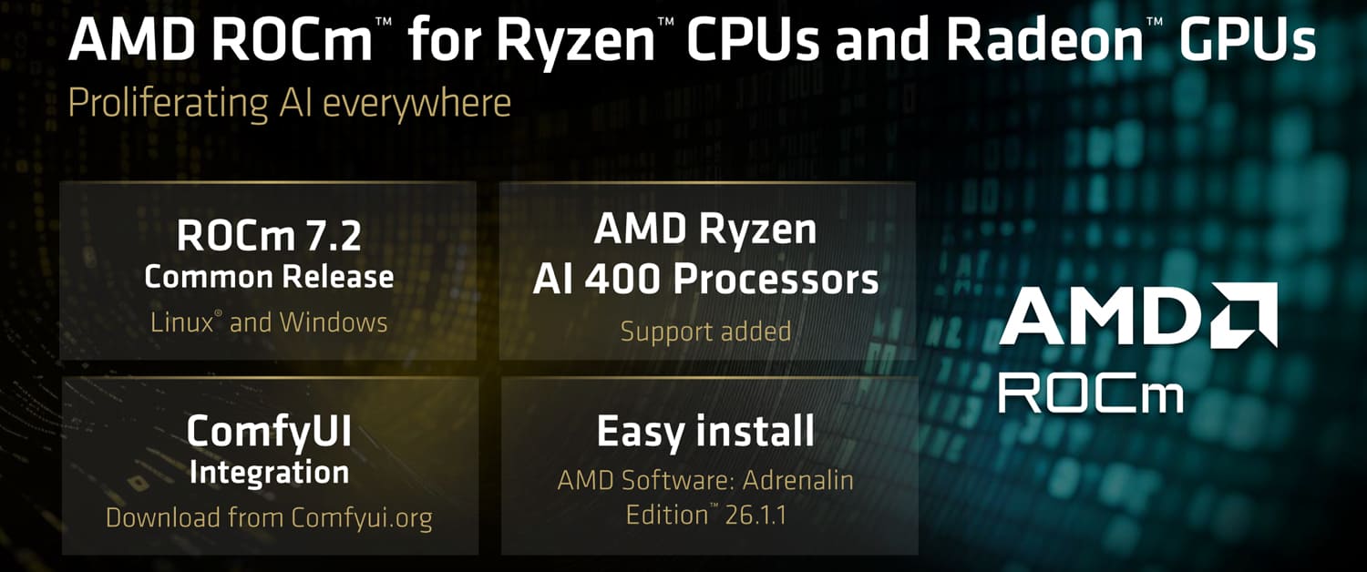 A empresa apresentou a versão ROCm 7.2.7 durante a CES 2026, com compatibilidade para os novos APUs Ryzen AI 400, conhecidos pelo codinome Gorgon Point.