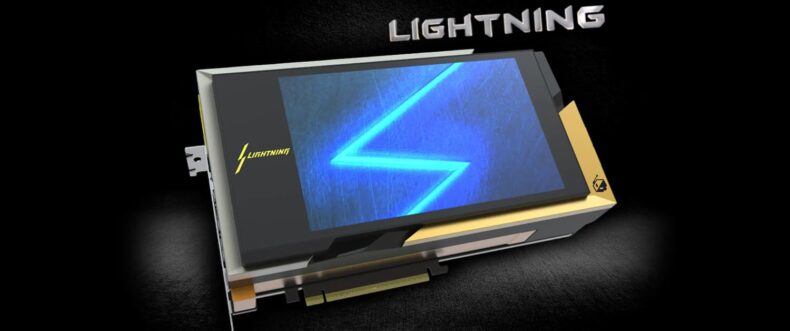 Além da refrigeração líquida, a GeForce RTX 5090 Lightning conta com uma ventoinha axial de alta pressão, desenhada para manter o fluxo de ar com baixo nível de ruído.