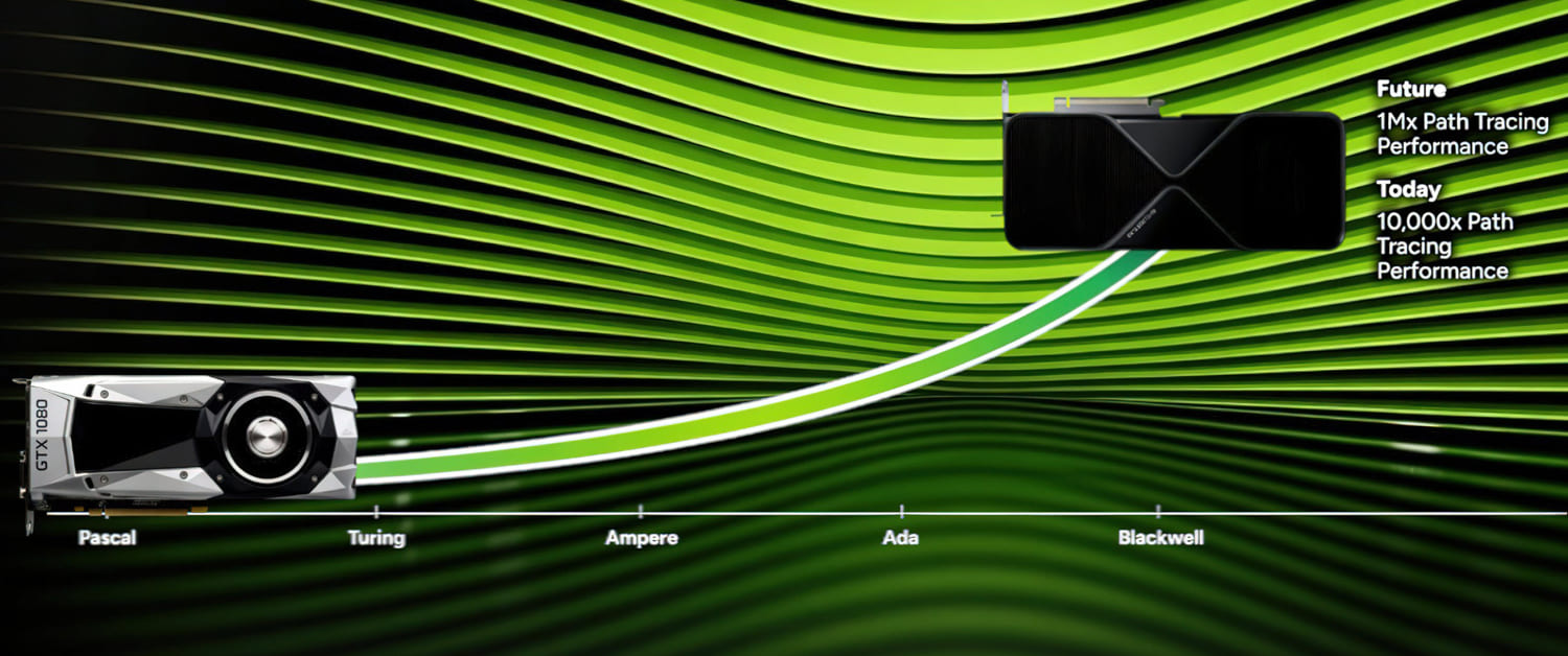 Segundo a empresa, as GPUs mais recentes baseadas na arquitetura Blackwell já conseguem atingir um ganho de até 10.000 vezes em Path Tracing quando comparadas à geração Pascal.